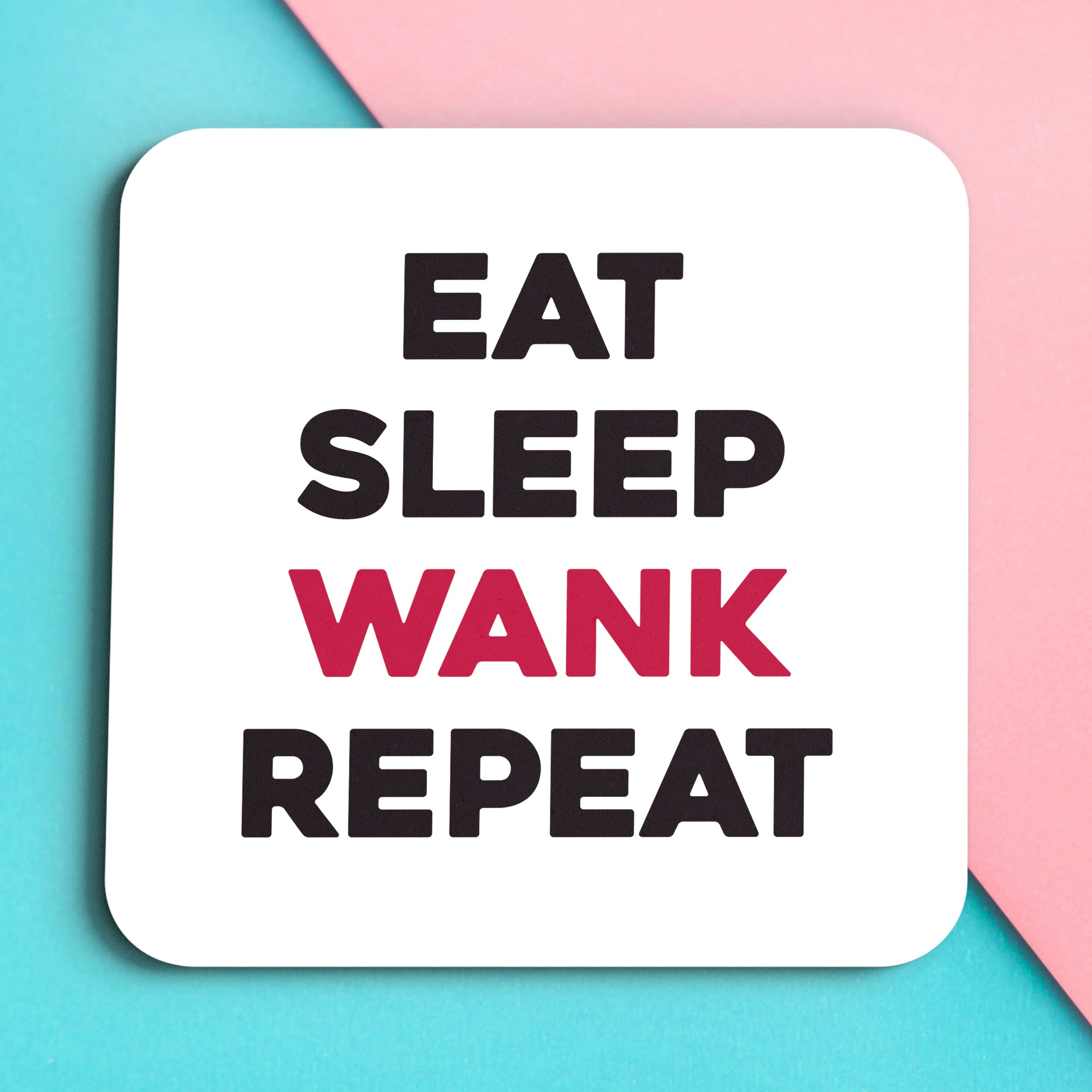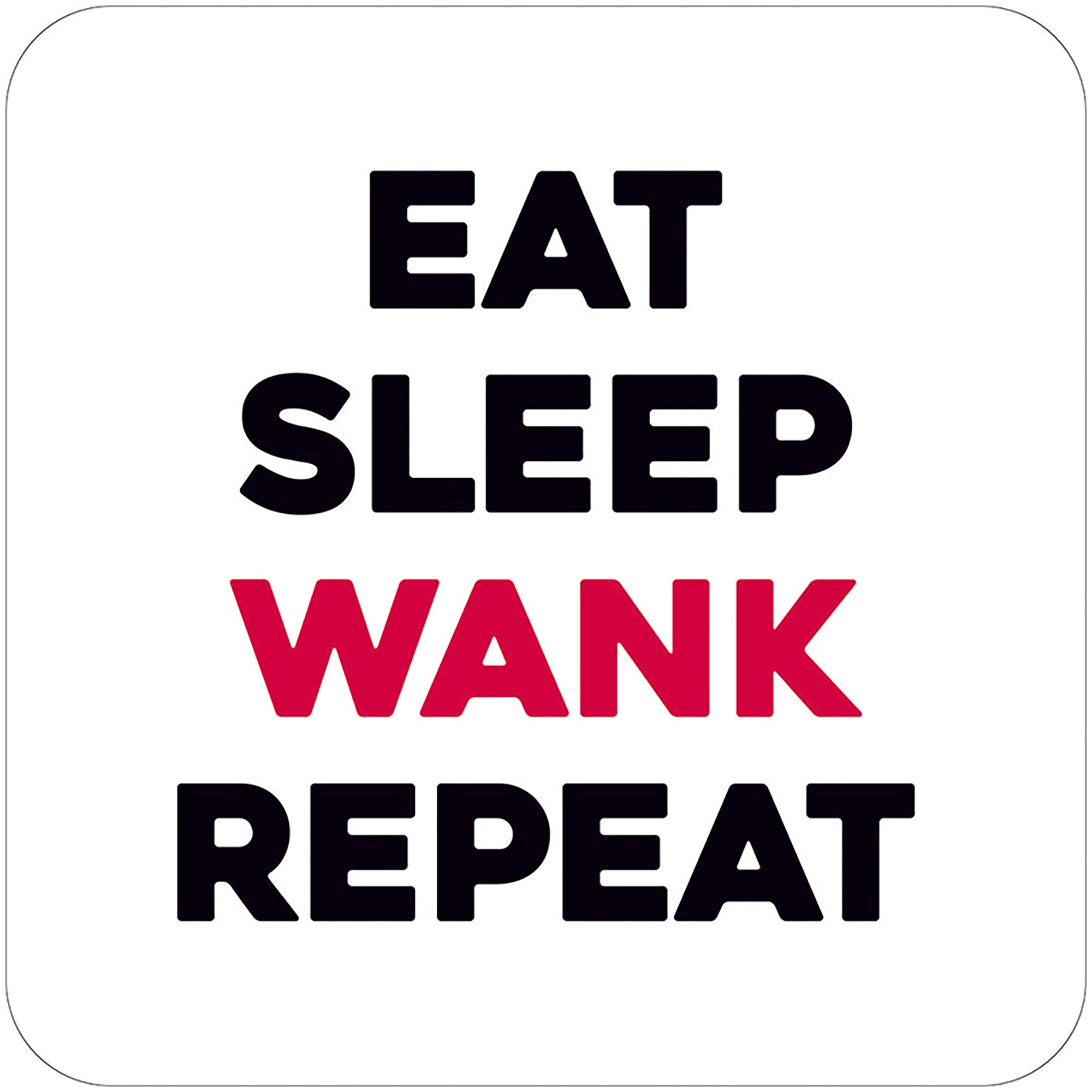 A bold and funny coaster featuring stacked typographic text that reads “eat sleep wank repeat.” The design uses a clean white background with chunky black lettering, while the word “wank” stands out in bright red for maximum impact.