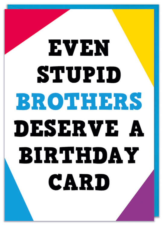 A white birthday card with four different coloured corners. Black and blue text in the middle of the card reads Even stupid brothers deserve a birthday card.
