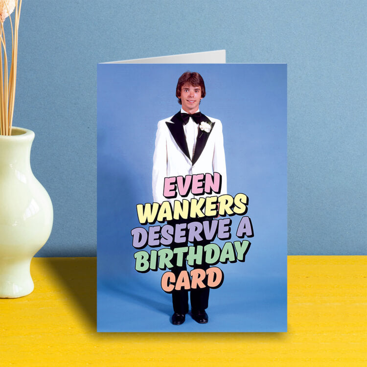 A birthday card with a smiling young man in a 1970s white tuxedo. Text in front of him read Even wankers deserve a birthday card.