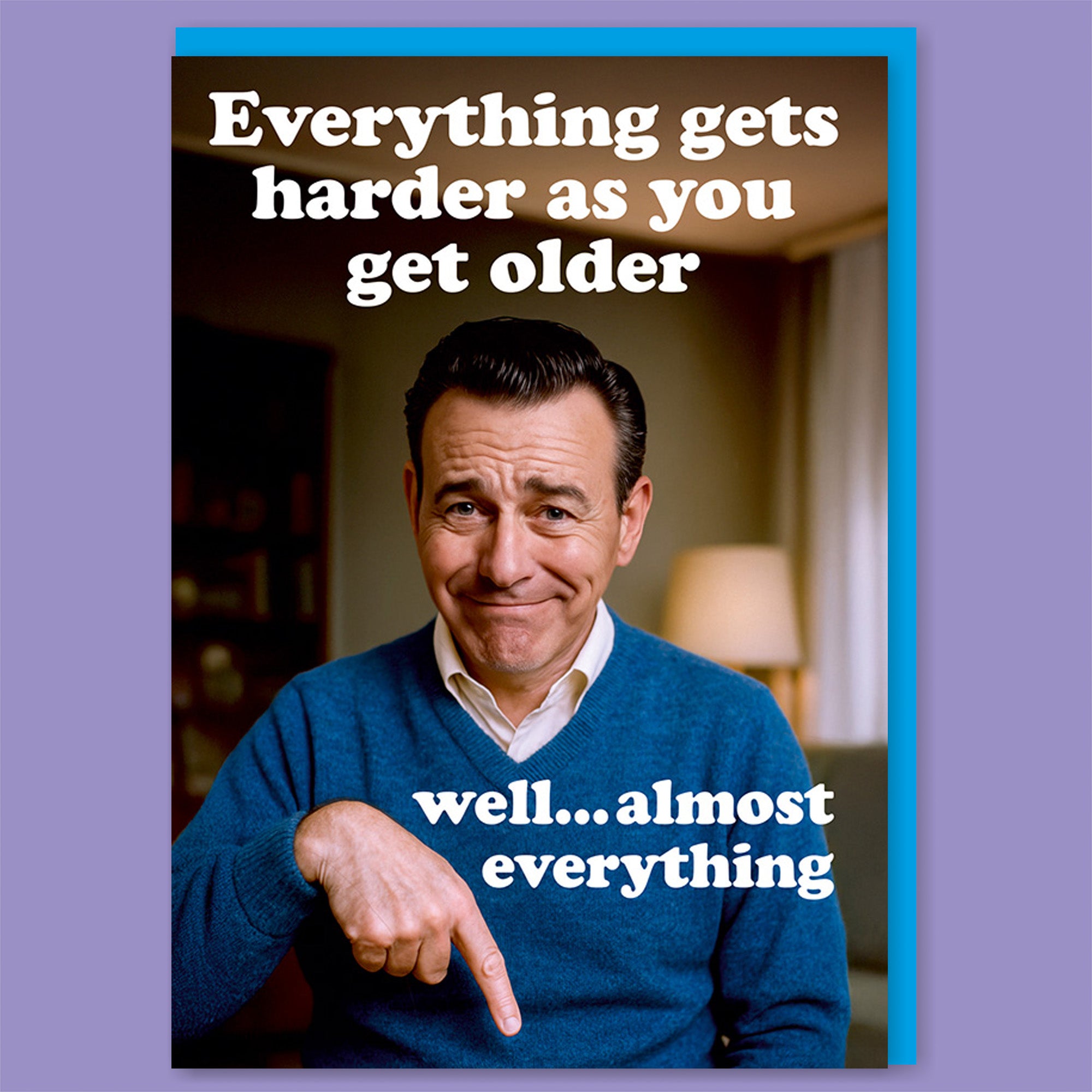 A funny birthday card featuring a vintage-style photograph of a middle-aged man wearing a blue sweater over a collared shirt. He has a slightly smug expression and is pointing downward with one finger. The background is a softly lit living room interior. Large rounded white text at the top reads “Everything gets harder as you get older” and smaller rounded white text near the bottom reads “well… almost everything.”