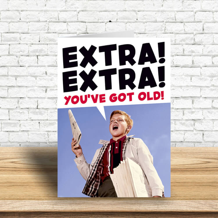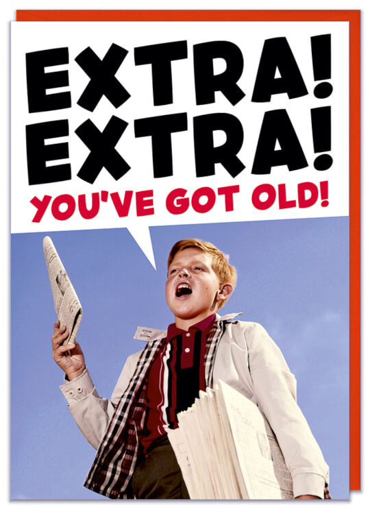 A birthday card with a 1960s picture of a young paperboy holding a paper. Bold black and red text above him reads Extra! Extra! You've got old!