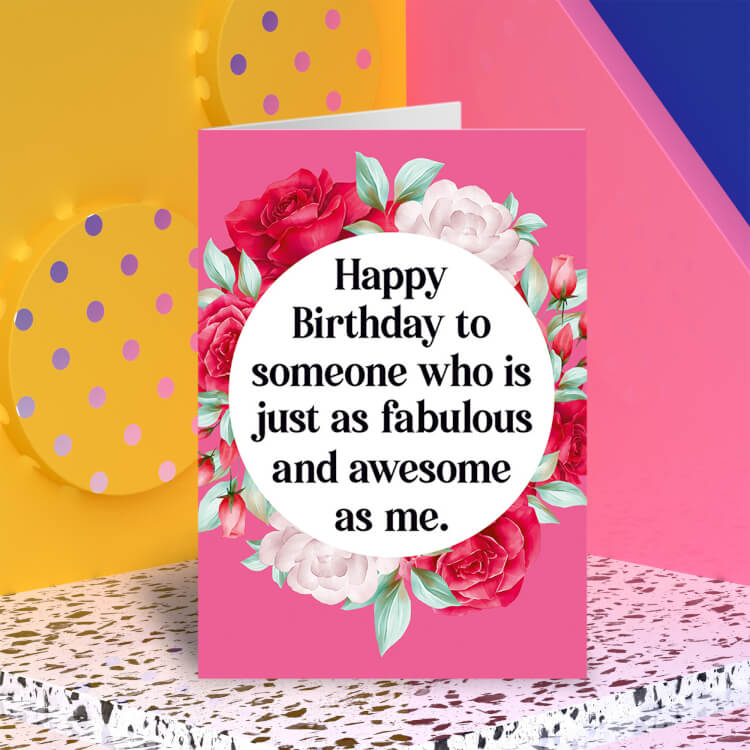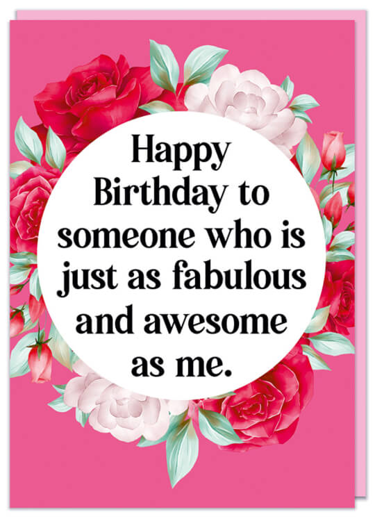 A funny birthday with smart black text that reads Happy birthday to someone who is just as fabulous and awesome as me in a white circle surrounded by pretty pink flowers.