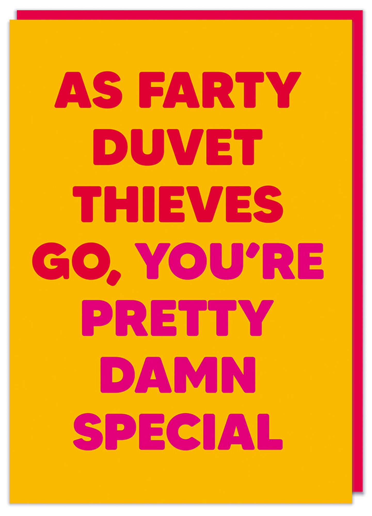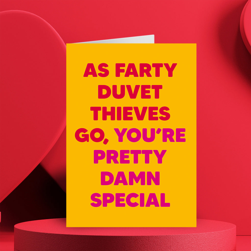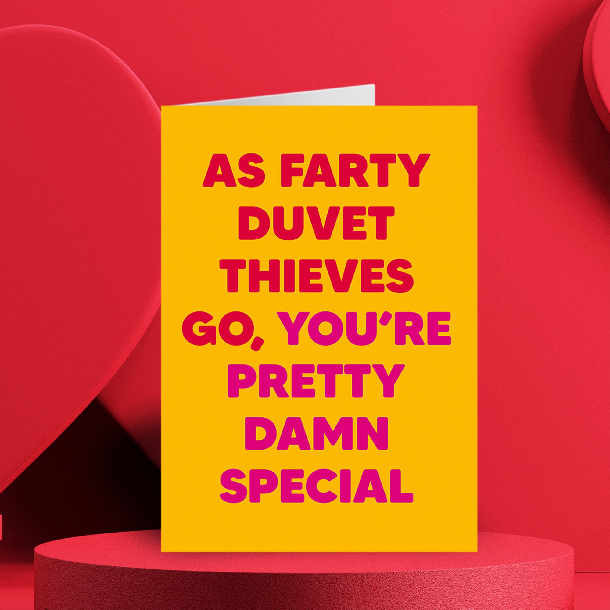 A Valentines card featuring bold typographic text only. The background is a solid bright yellow. Large uppercase text in red and pink reads “As farty duvet thieves go, you’re pretty damn special.”