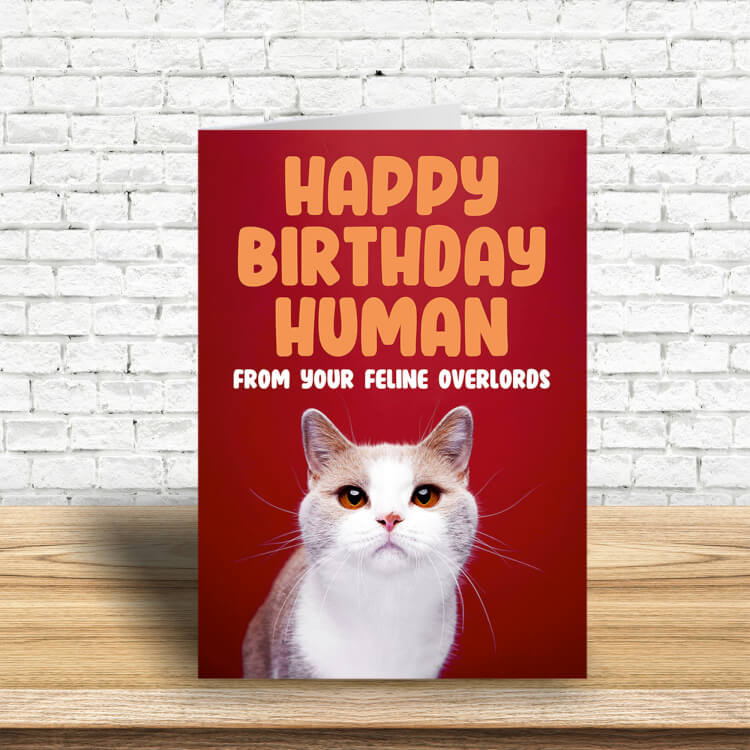 A birthday card with a picture of an aloof looking white cat staring to camera. Orange and text above reads Happy Birthday human from your feline overlords.