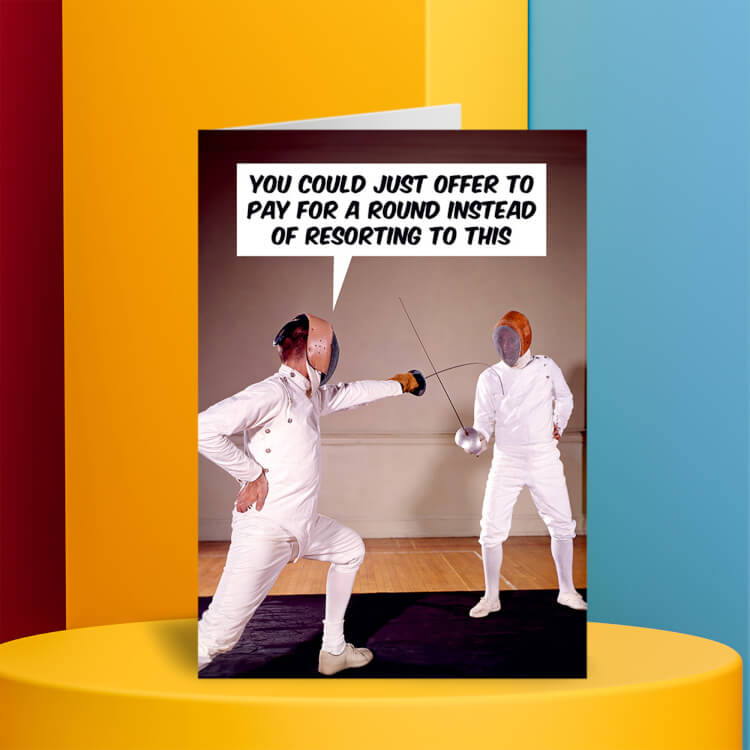 A funny retro birthday card featuring two men in fencing costumes drawing their swords at each other. One says You could just offer to pay for a round instead of resorting to this.