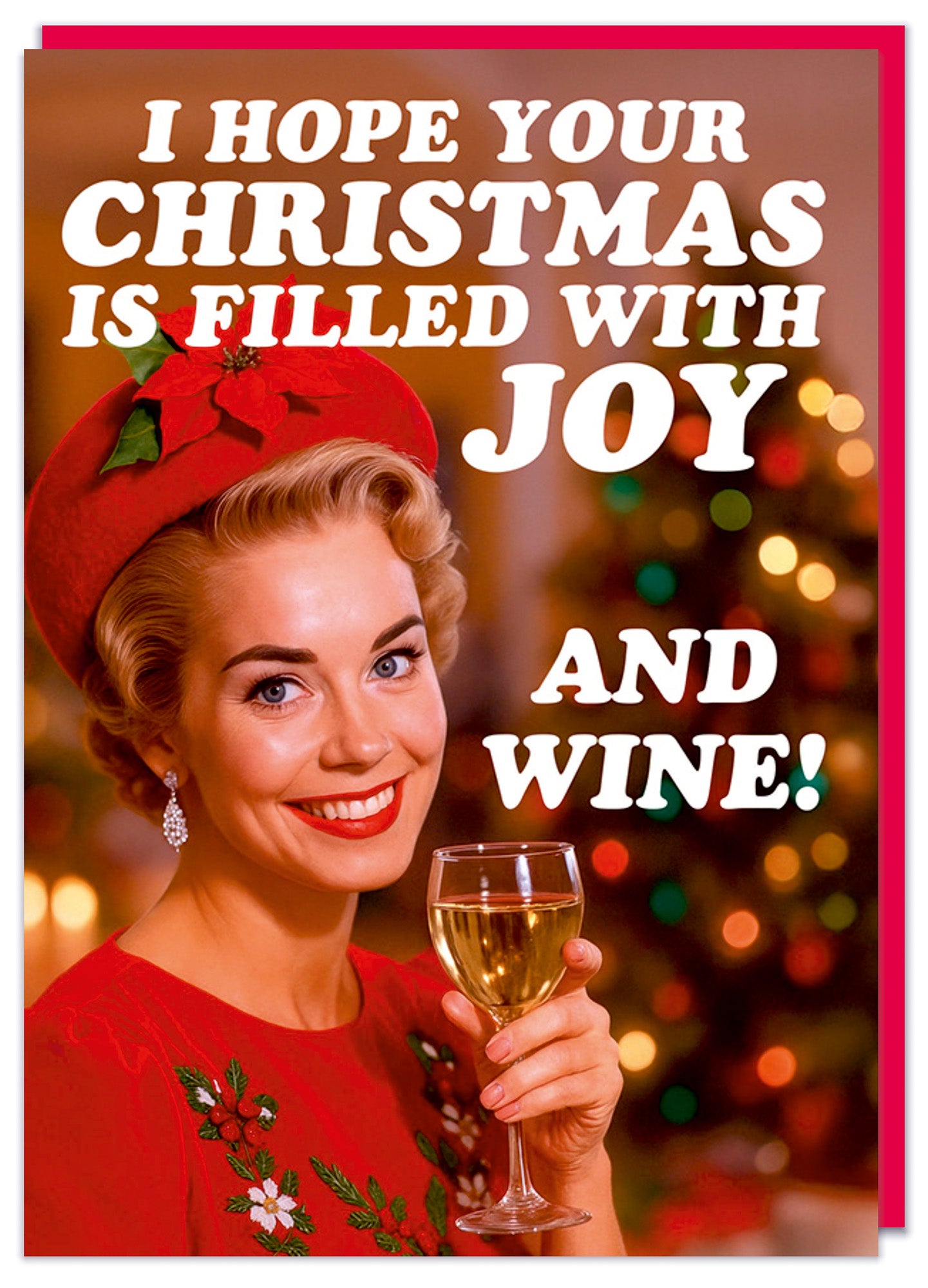 A funny Christmas card featuring a smiling retro-style woman in a red hat and embroidered dress, holding up a glass of white wine in front of a glowing Christmas tree. White rounded text above her reads I hope your Christmas is filled with joy and wine!.