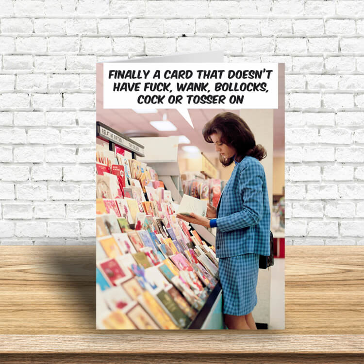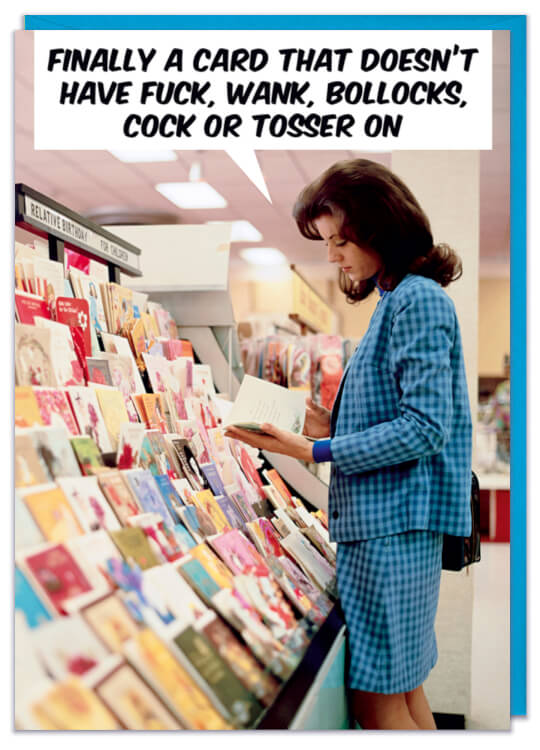 A birthday card with a vintage style picture of a woman looking at a greetings card in a shop and a speech bubble that reads ‘Finally a card that doesn’t have fuck, wank, bollocks, cock or tosser on’ in capitalised black font.