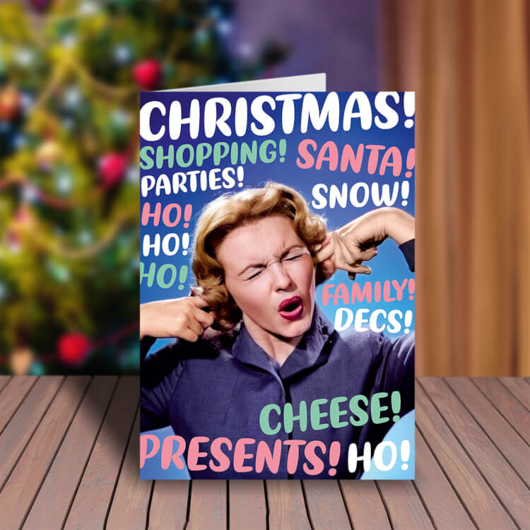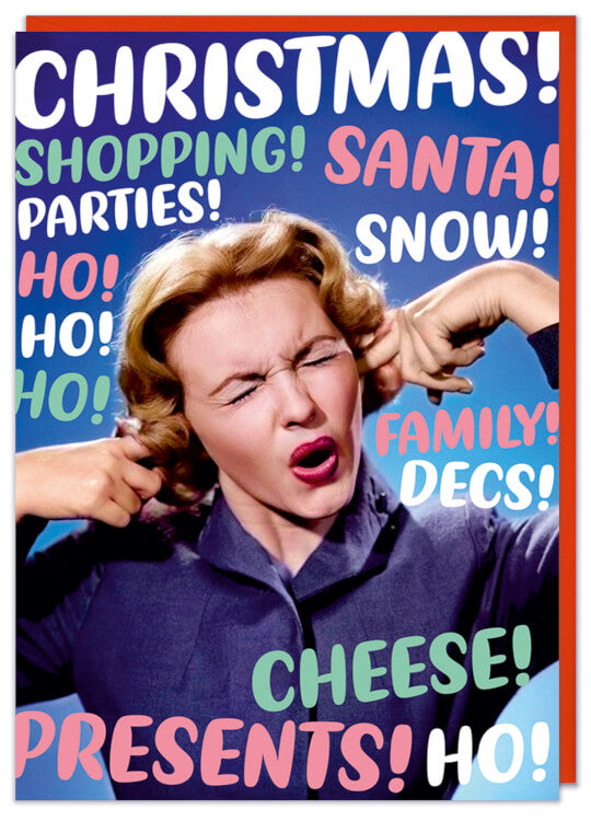 A Christmas card with a retro picture of a woman with her fingers in her ears. She is surrounded by rounded pastel coloured text that reads Christmas, Shopping, Parties, Snow, Family, Decs etc.