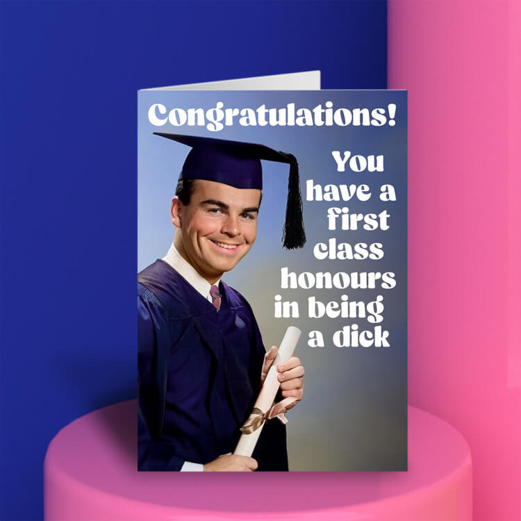 A greeting card featuring a retro photo of a smiling young man in his graduation cap and gown. White text above and beside him reads Congratulations! You have a first class honours in being a dick.