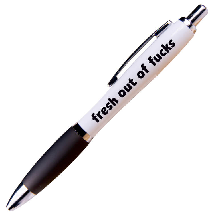 A white ballpoint pen with a black grip and black ink. Black rounded text reads Fresh out of fucks.