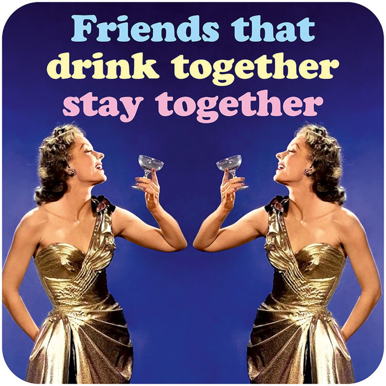 A coaster with a picture of two glamourous facing each other holding up a cocktail glass. Pastel blue, yellow and pink text reads Friends and drink together stay together.