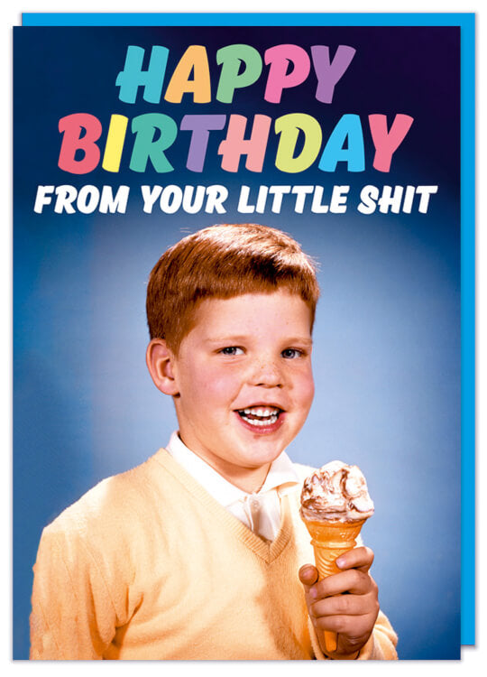 A birthday card with a retro picture of a sweet looking little boy holding an ice cream cone. Multicoloured pastel and white capitalized text above reads Happy Birthday from your little shit.