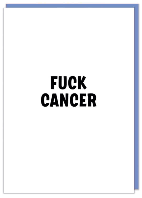 A plain white greeting card with plain black text in the middle that reads Fuck cancer.