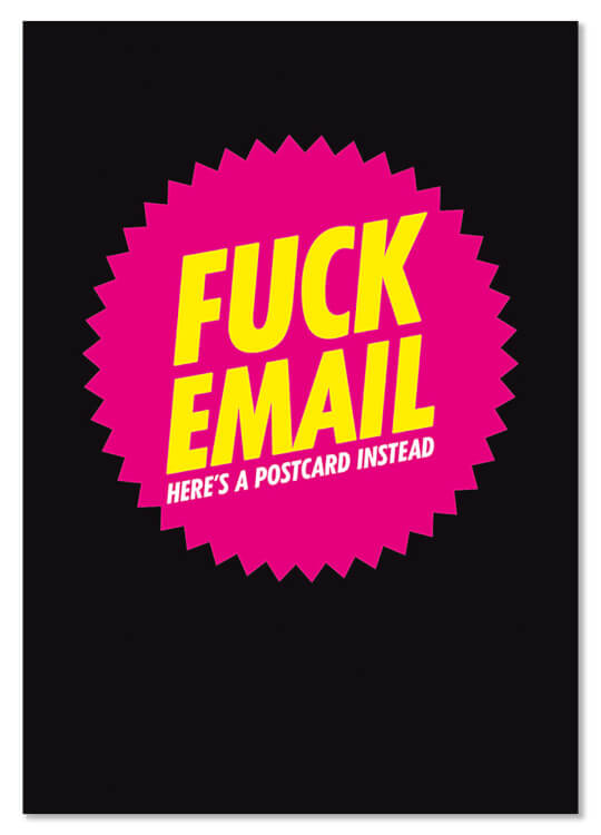 Ah... remember the days when you used to communicate with a friend by never actually getting them on the landline, because they were out or in bed, and resorting to snail mail instead? Yeh! Fuck email, let's go back to that! A jet black postcard with a bright pink rosette style star, with the big, bold words 'Fuck Email. Here's a postcard instead' written in bright yellow and white capitals.