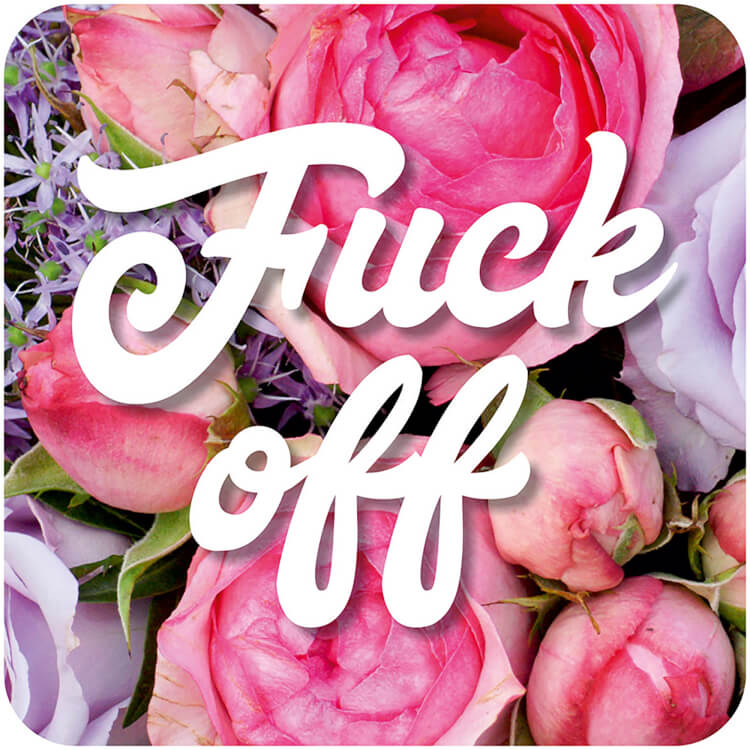A coaster with a pretty picture of assorted pink flowers with the words Fuck Off written over it in a fancy font.