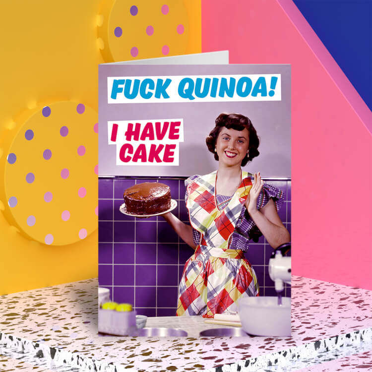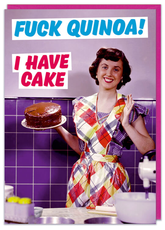 A greeting card with a with a picture of a 1950s housewife holding a chocolate cake. The card reads Fuck quinoa! I have cake