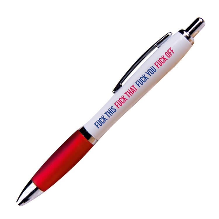 A white ballpoint pen with a red grip and black ink. Alternating deep red and blue text reads Fuck this, fuck that, fuck you, fuck off.