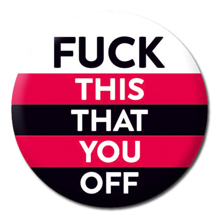 A white black and red striped badge with complimentary straight text that reads Fuck this that you off.