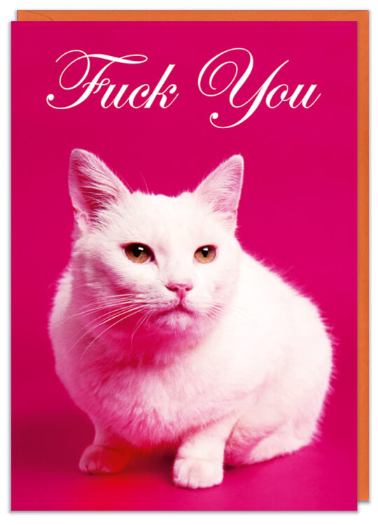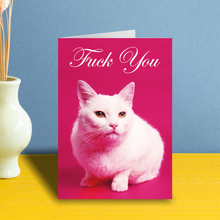 A birthday card with a photo of a moody looking white cat resting on a pink background. Fancy text above reads Fuck You.