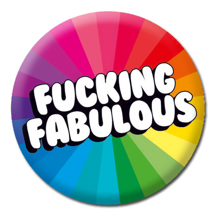 A bright coloured badge with a rainbow coloured pattern from the centre. Black outlined rounded white text reads Fucking fabulous.