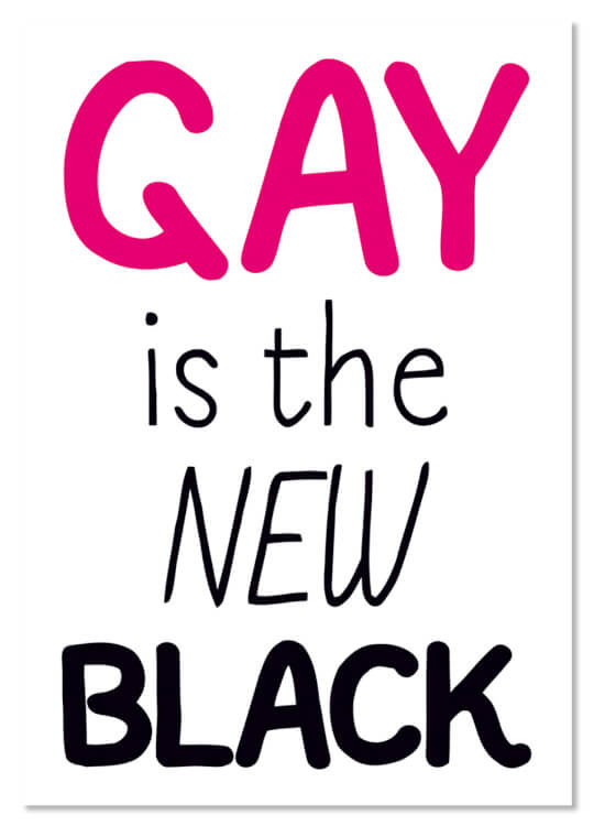 Fashions come and fashions go, but we like to keep up with the trends. Make your friends laugh with this great addition to our Postcard range. A nice, crisply white, modern postcard, with the words 'Gay is the new Black' in different bold pink and slim black fonts.