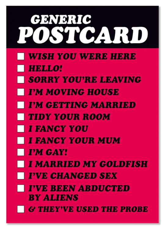 A bright pink postcard with the words 'Generic Postcard' in white, on a black background, followed by the choice of options for you to tick: 'Wish you were here. Hello! Sorry you're leaving. I'm moving house. I'm getting married. Tidy your room. I fancy you. I fancy your mum. I'm gay! I married my goldfish. I've changed sex. I've been abducted by aliens. & they used the probe.'