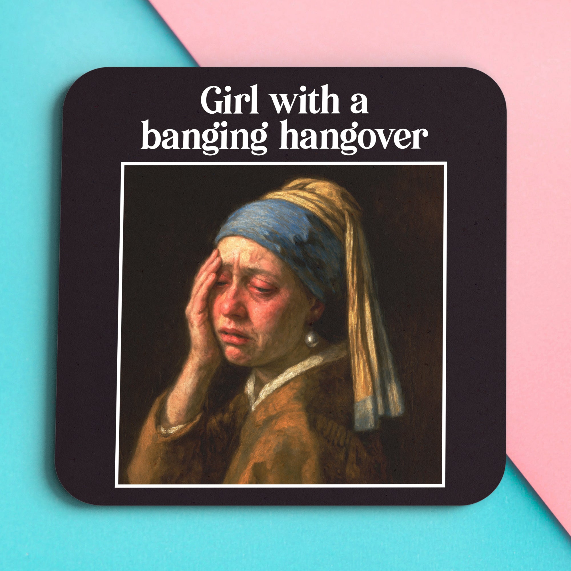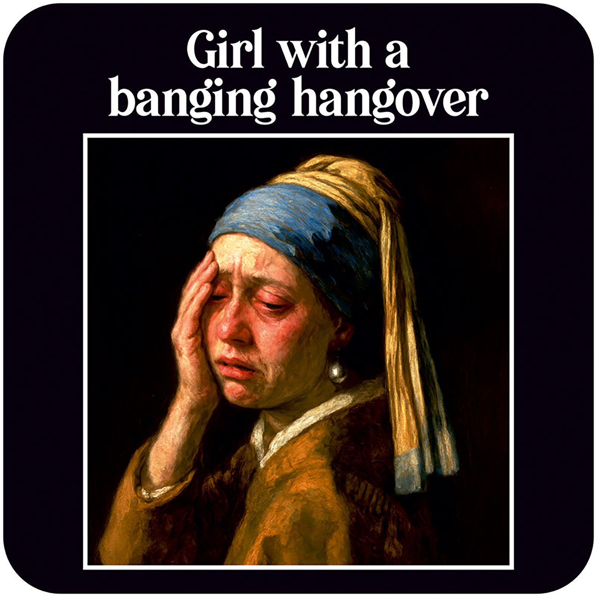 A humorous coaster featuring the text “girl with a banging hangover” in elegant serif lettering. The design playfully reimagines a classic-style painting of a woman clutching her head in visible distress, framed on a black background to give it an art-gallery feel while very much not being gallery behaviour.