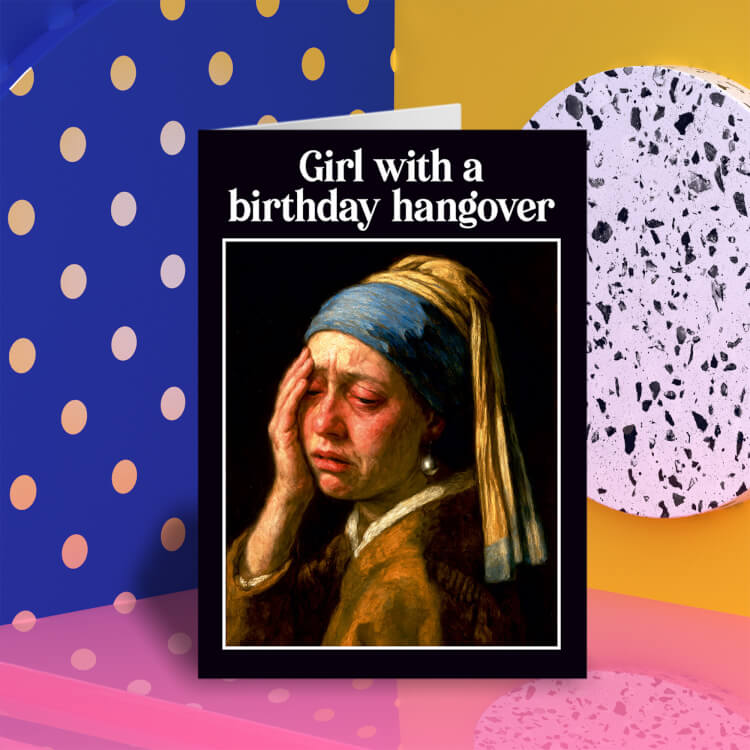 A funny birthday card featuring an illustration of Girl with a pearl earing but it has been manipulated to make her look like she has a massive hangover. White text above reads Girl with a birthday hangover.