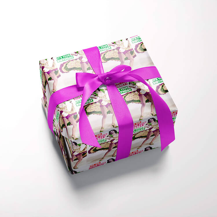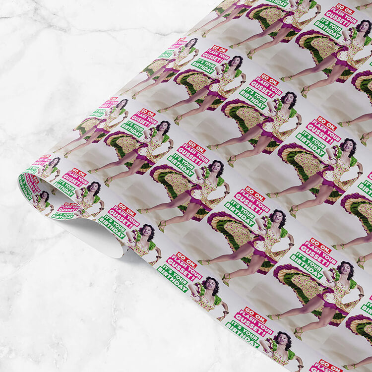 White wrapping paper with a vintage style photo of a woman doing the Flamenco dance and flashing her underwear and thighs repeated across the entire paper and next to her are the words ‘Go on flash your gusset! It’s your birthday’ in capitalised white, rounded font against red, pink and green banners.