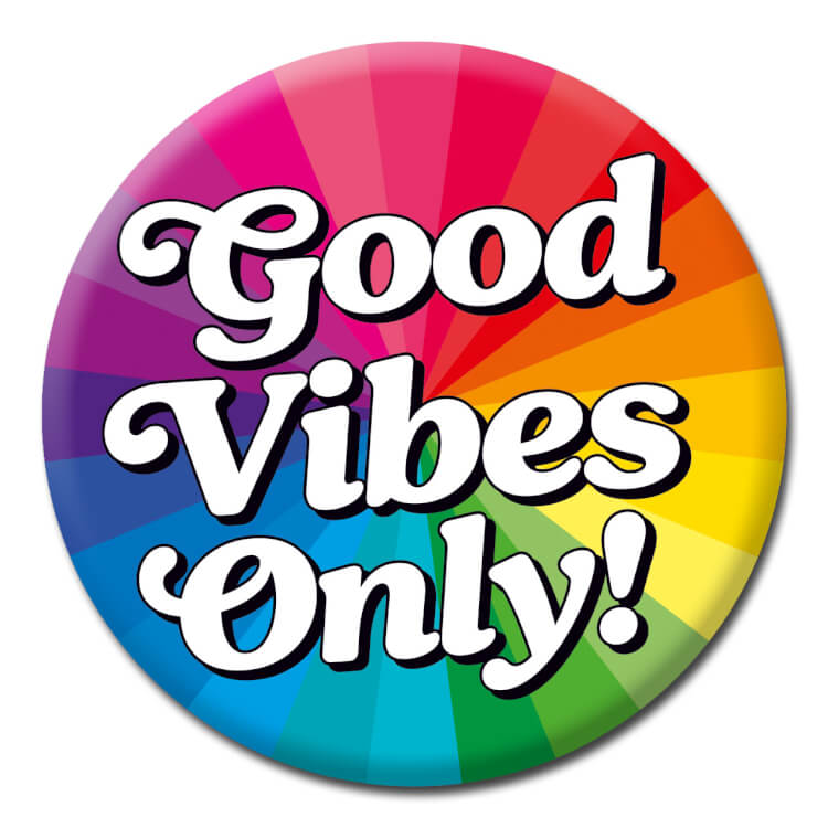 This badge has a rainbow pattern exploding from the centre with curvy white text over the top reading Good vibes only!