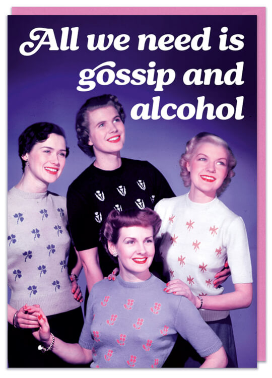 A birthday card with a vintage picture of four smiling wholesome looking women looking off camera. White text above them reads All we need is gossip and alcohol.