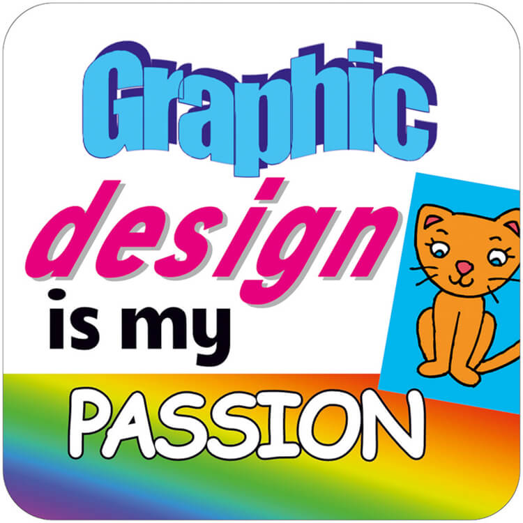 A white coaster with mismatched fonts and patterns, including a cartoon cat with text that reads Graphic design is my passion.