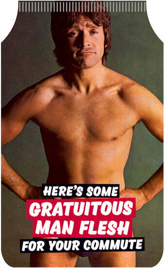 A grey travel wallet with a retro style photo of a muscular, shirtless man and conveniently below him are the words ‘Here’s some gratuitous man flesh for your commute’ in capitalised white font against black and pink banners.