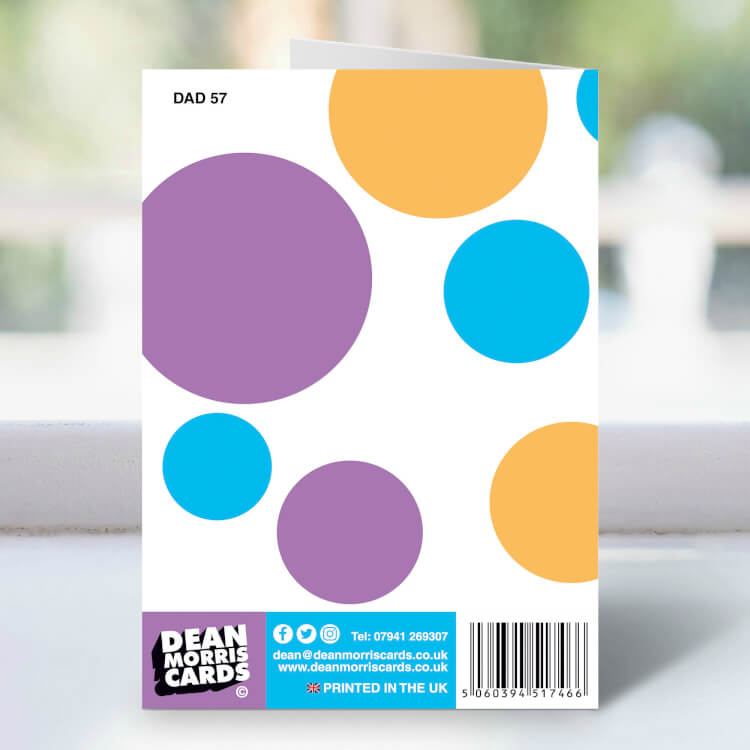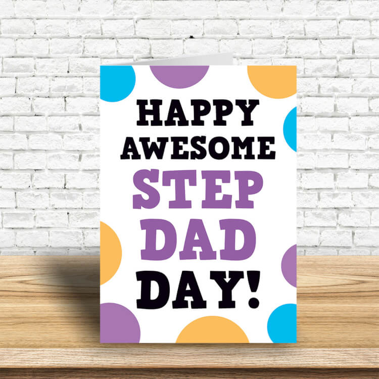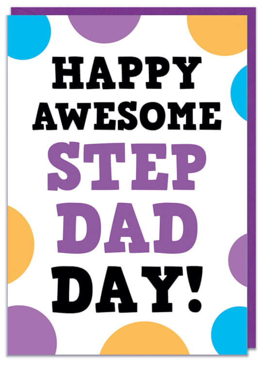 A White Fathers Day card with covered with different coloured spots. Black and purple text in the middle reads Happy awesome Step Dad day!