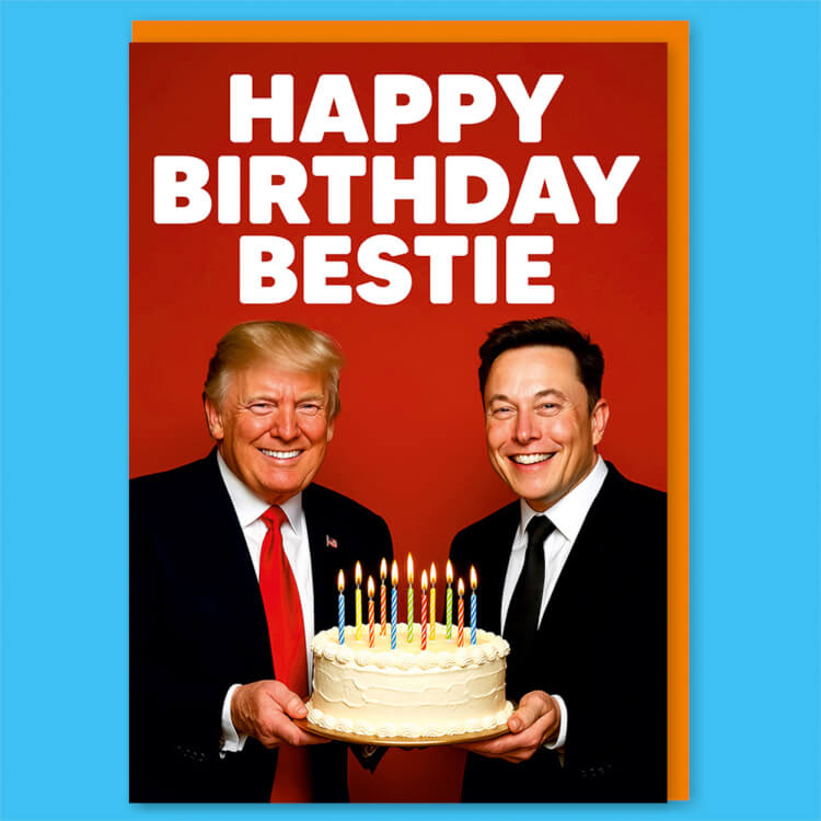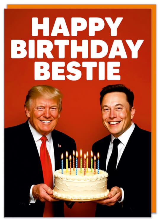A funny birthday card featuring a picture of Donald Trump and Elon Musk holding a birthday cake with lots of candles against a deep red background. Bold white text above reads Happy birthday bestie.