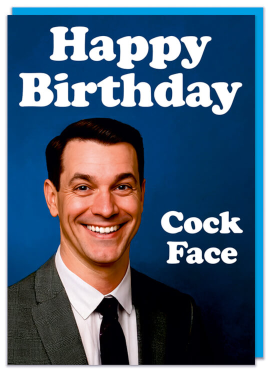 A funny birthday card featuring a 1960s picture of a smiling man in a suit against a deep blue background. White text reads Happy birthday cock face.