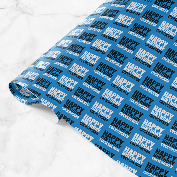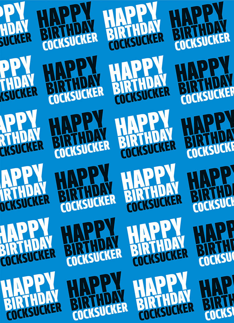 Bright blue wrapping paper with the words ‘Happy birthday cocksucker’ at a slanted angle in capitalised white and blue font repeated over the entire paper.