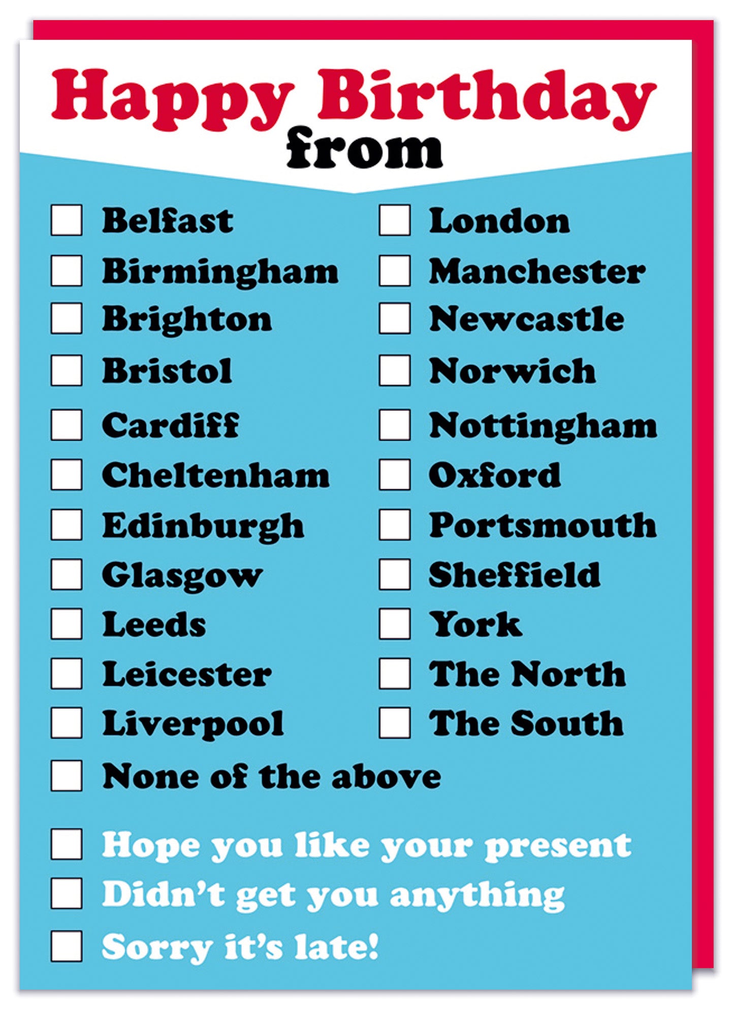 A light blue birthday card with red and black text in a white box at the top that reads Happy birthday from. Options listed below are as follows: Belfast, Birmingham, Brighton, Bristol, Cardiff, Cheltenham, Edinburgh, Glasgow, Leeds, Leicester, Liverpool, London, Manchester, Newcastle, Norwich, Nottingham, Oxford, Portsmouth, Sheffield, York, The North and The South. Other options listed are: Hope you like your present, Didn't get you anything and Sorry it's late!