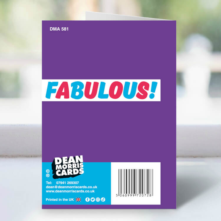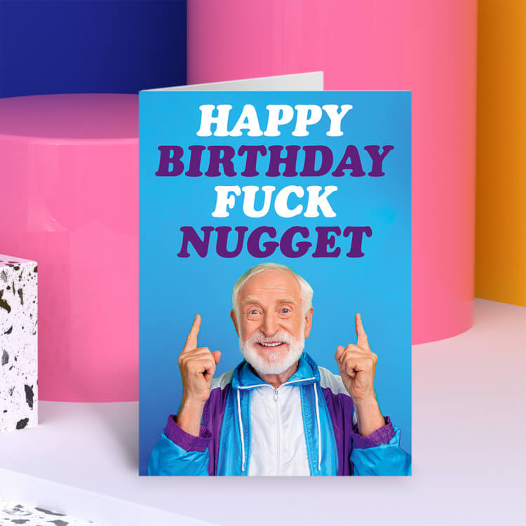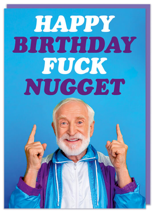 A funny birthday card with a photo of a smiling bearded old man in a blue and purple tracksuit pointing upwards to white and purple text that reads Happy birthday fuck nugget.