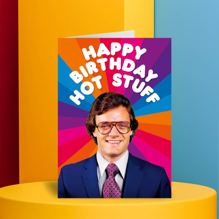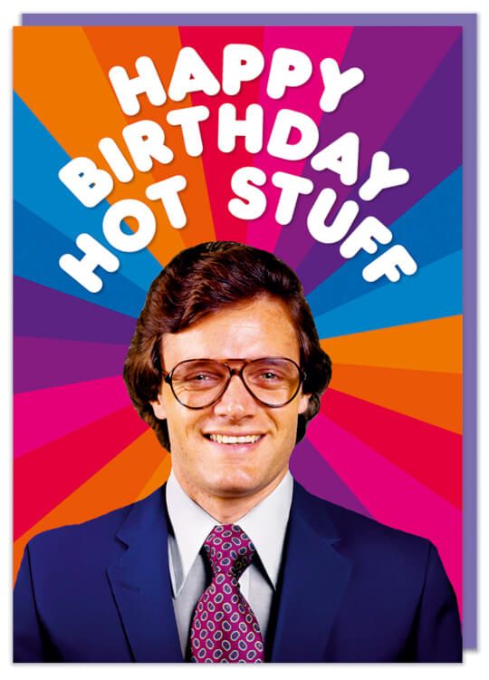 A funny birthday card featuring a retro picture of a middle aged man with glasses and a suit standing in front of a bold colour pattern. White text around his head reads Happy birthday hot stuff.