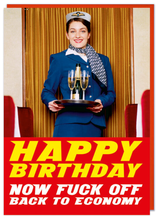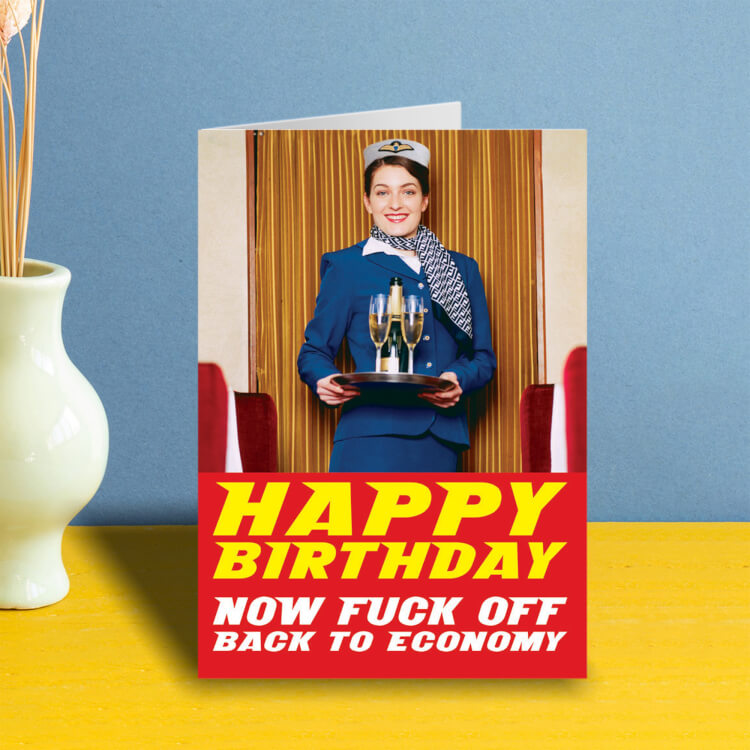 A birthday card with a smiling cabin crew holding a tray of champagne. Below her text reads Happy Birthday now fuck off back to economy.