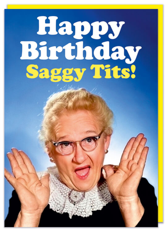 A birthday card with a 1950s picture of an excited elderly woman. Bold white and yellow rounded text above her reads Happy birthday saggy tits.