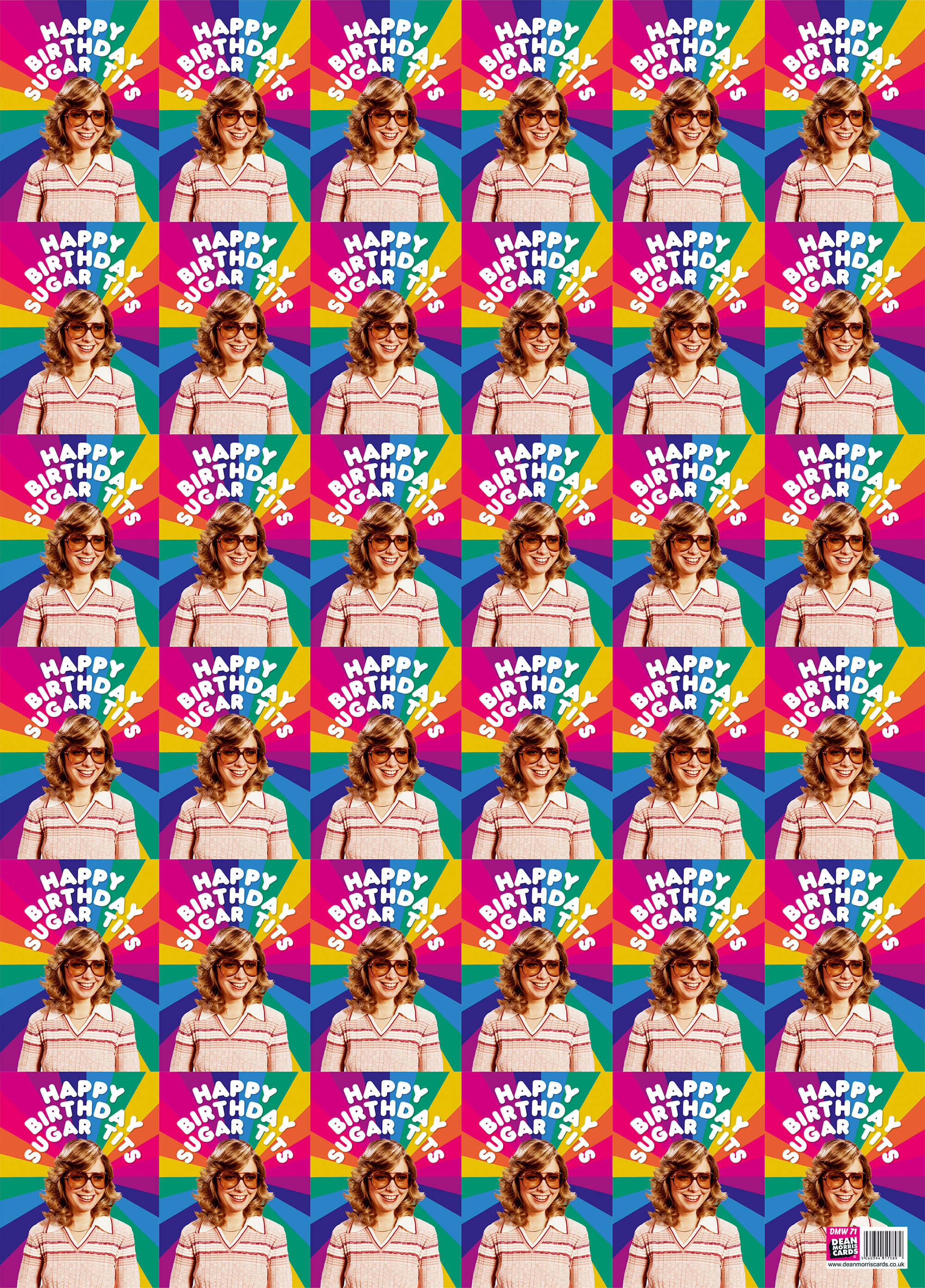 Birthday wrapping paper with the repeated image of a smiling 1970s woman with large sunglasses surrounded by curvy white text above her that reads Happy Birthday sugar tits.