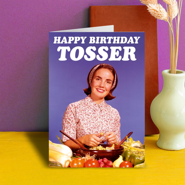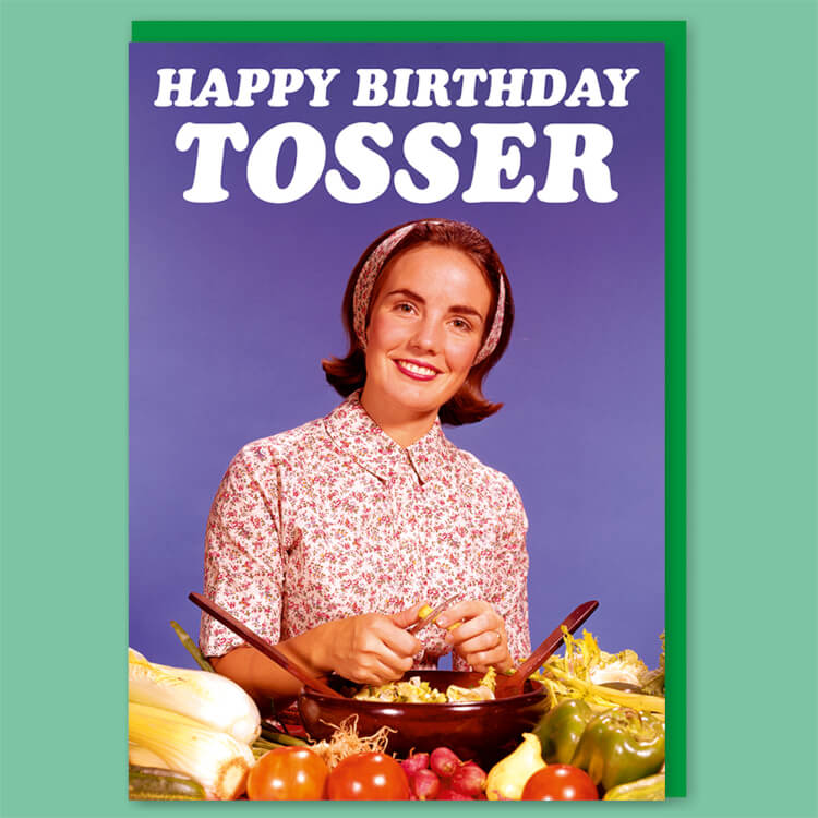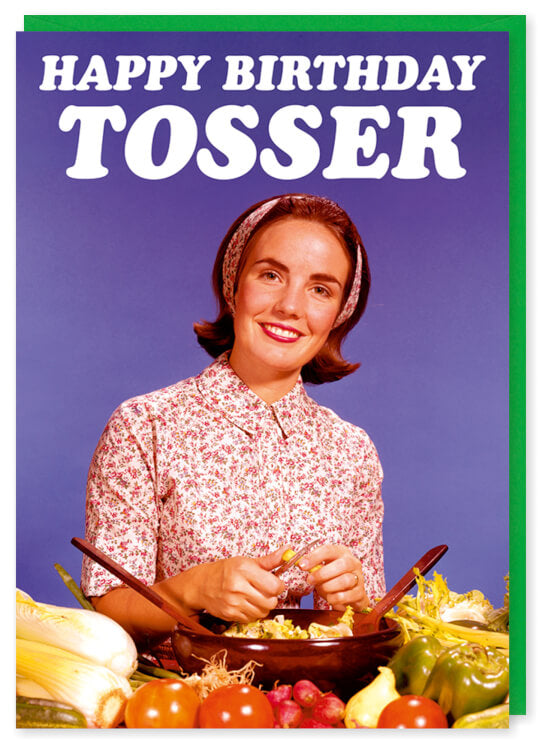 A birthday card with a 1960's photo of a smiling woman standing behind a salad bowl and a plentiful supply and fruit and vegetables. The text above her reads Happy Birthday tosser