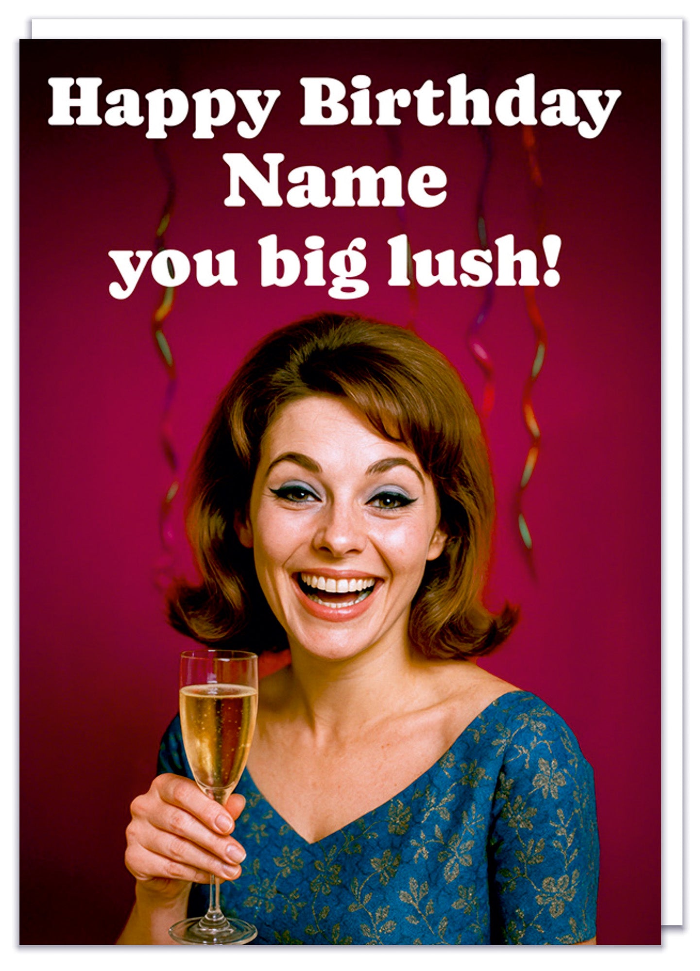 A funny personalisable birthday card with a 1960s picture of a smiling brown haired woman drinking a glass of champange with white text above her that reads Happy birthday - name - you big lush!