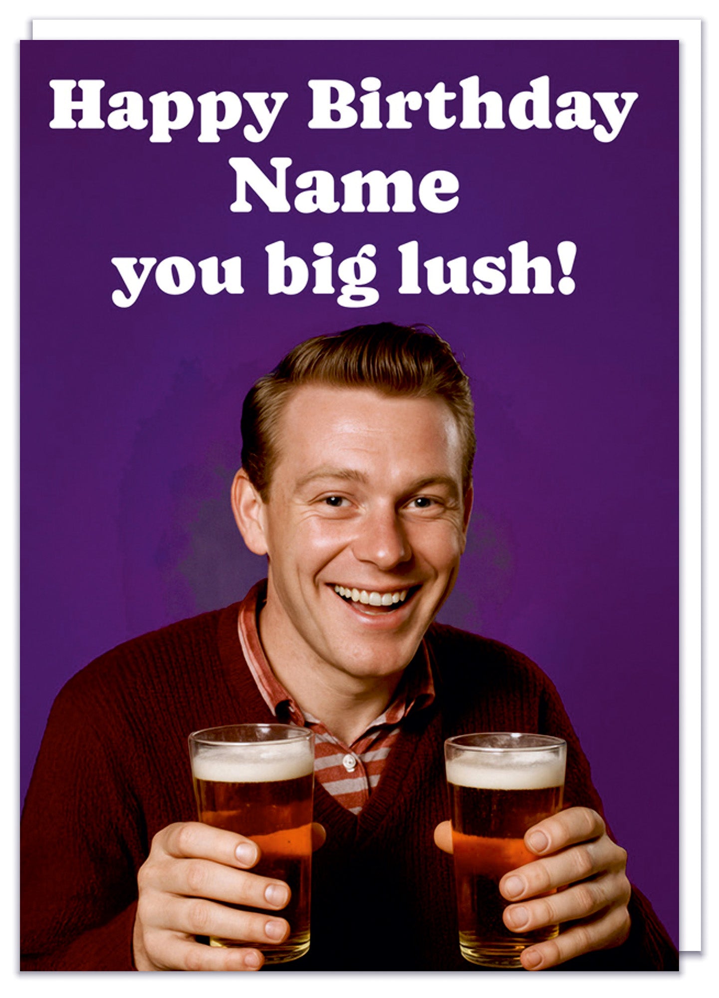 A funny personalisable birthday card with a 1960s picture of a smiling brown haired man holding two pints of beer with white text above her that reads Happy birthday - name - you big lush!