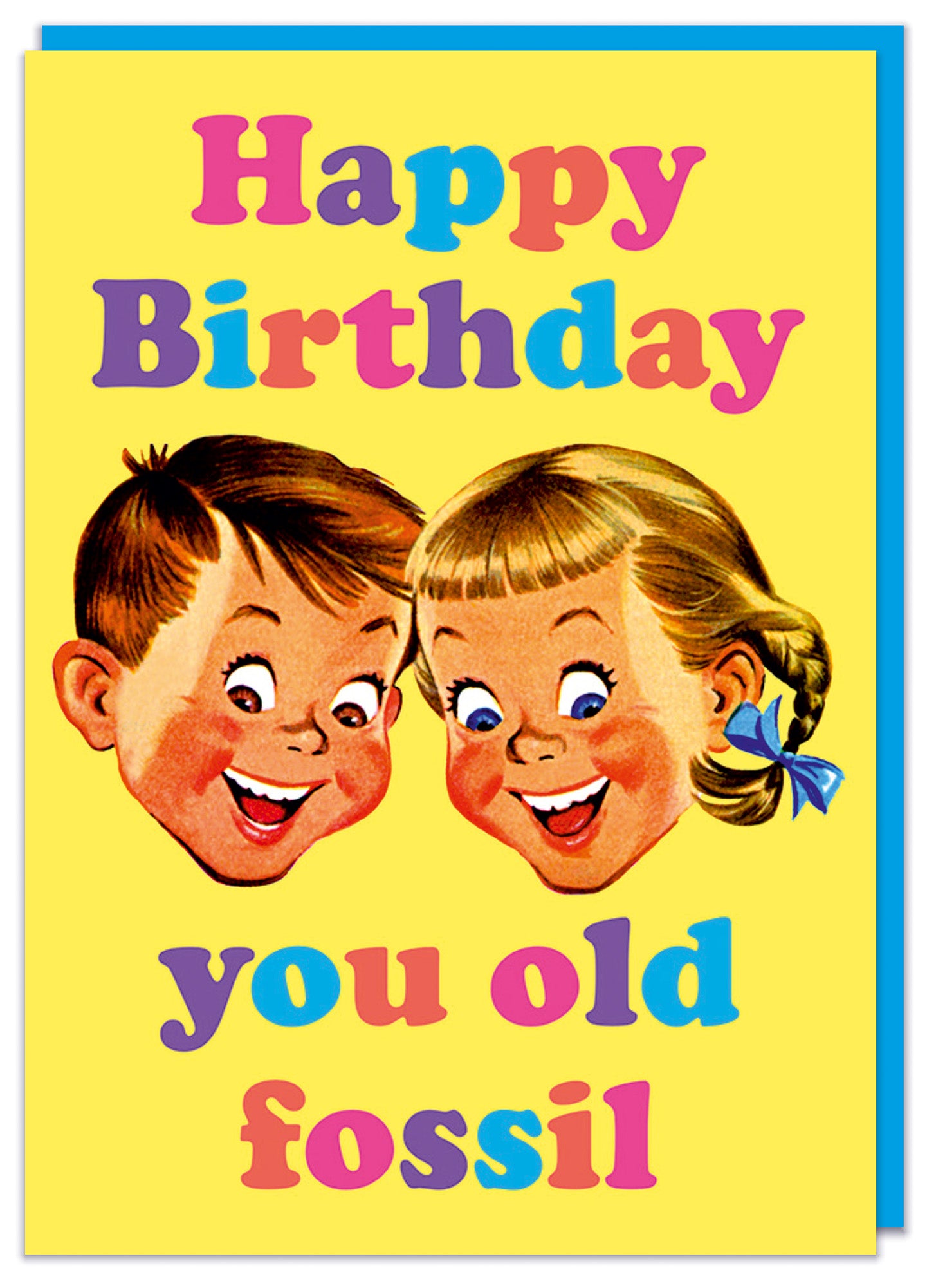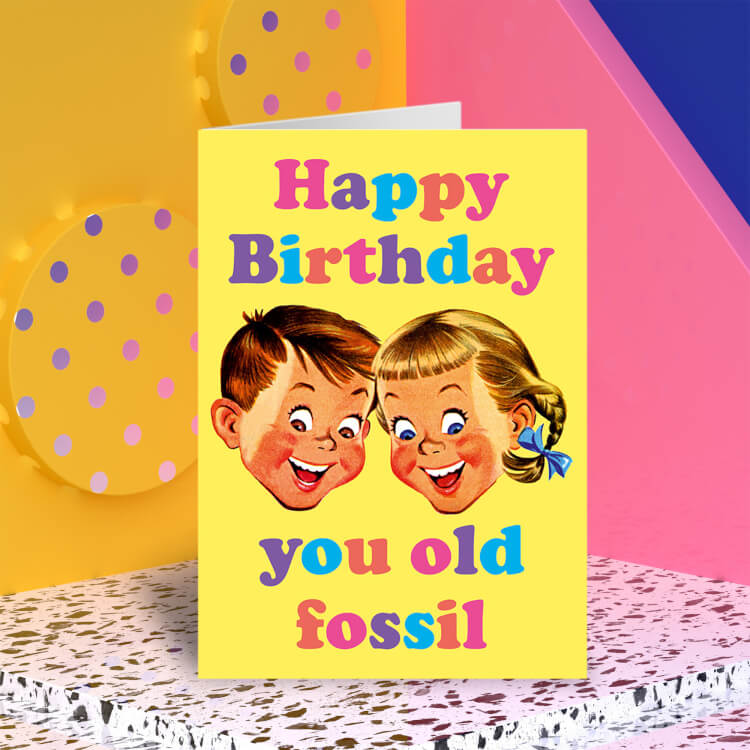 A yellow birthday card with a vintage illustration of two smiling children's faces. Above and below multi coloured text reads Happy birthday you old fossil.