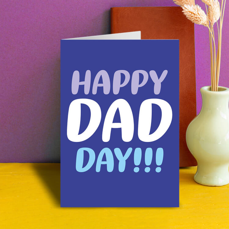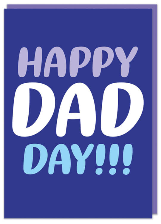 A funny blue Father's Day card with white, purple and pale blue rounded text that reads Happy dad day!!!