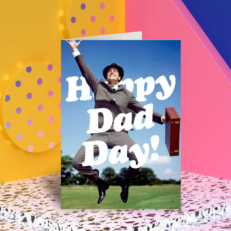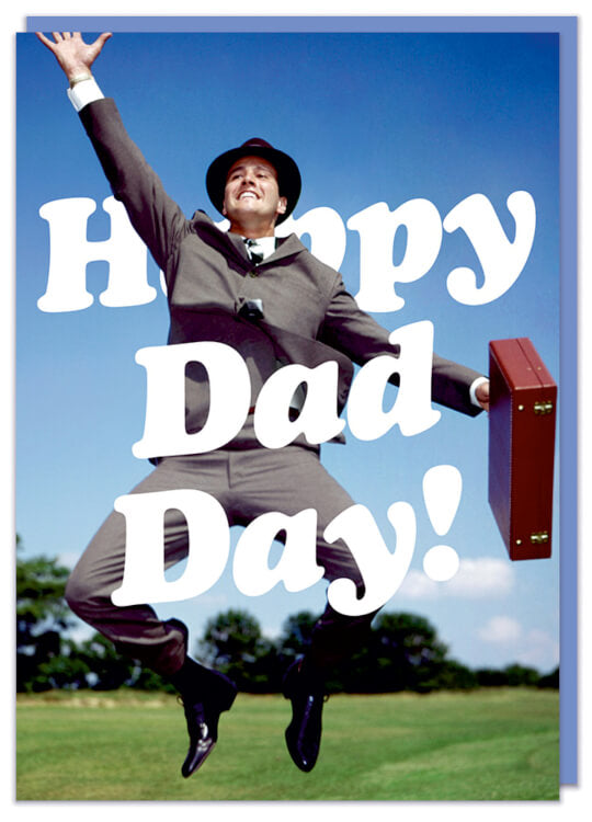 A funny card featuring a retro picture of an excited businessman jumping for joy. Behind and in front of him bold white text reads Happy Dad Day.