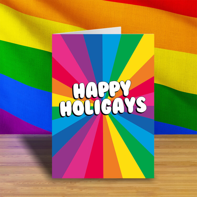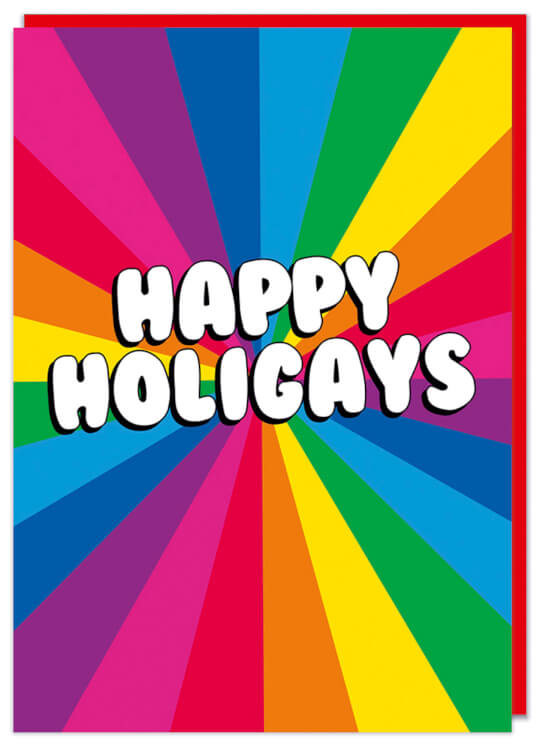 A Christmas card with a bright rainbow pattern. In the middle is bold white rounded text with a black outline that reads Happy Holigays
